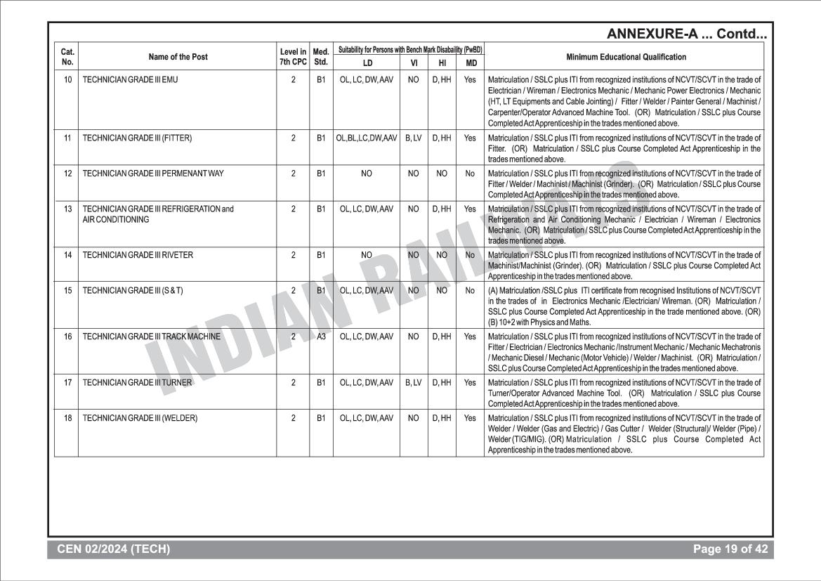 As per the latest RRB Technician Eligibility Criteria, those candidates applying for the RRB Technician Posts should have the following educational qualifications for specified posts.